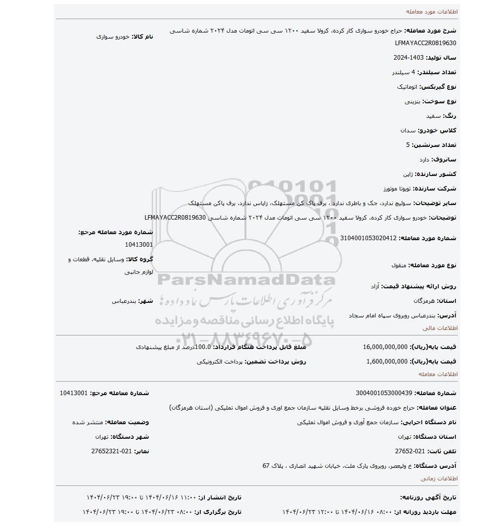 مزایده، خودرو سواری کار کرده، کرولا سفید ۱۲۰۰ سی سی اتومات مدل ۲۰۲۴ شماره شاسی LFMAYACC2R0819630