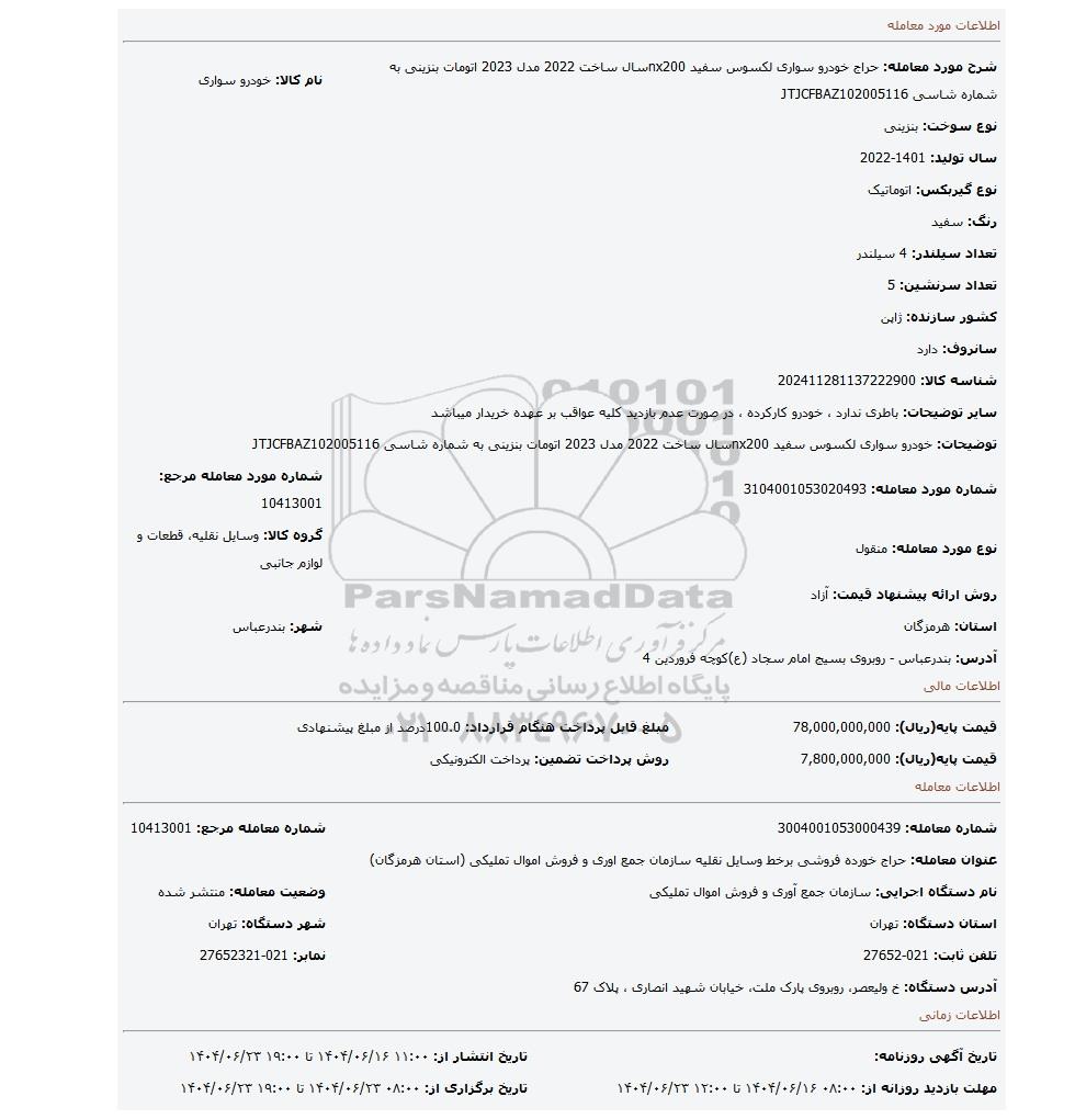 | شرح مورد معامله: حراج خودرو سواری لکسوس سفید nx200سال ساخت 2022 مدل 2023 اتومات بنزینی به شماره شاسی JTJCFBAZ102005116 | نام کالا: خودرو سواری | |