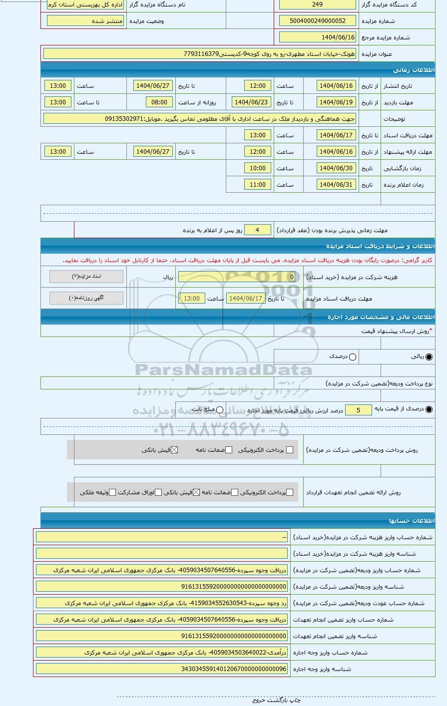 | شماره مورد اجاره | 5104000249000050 | نوع برگزاری مزایده | مزایده عمومی | |