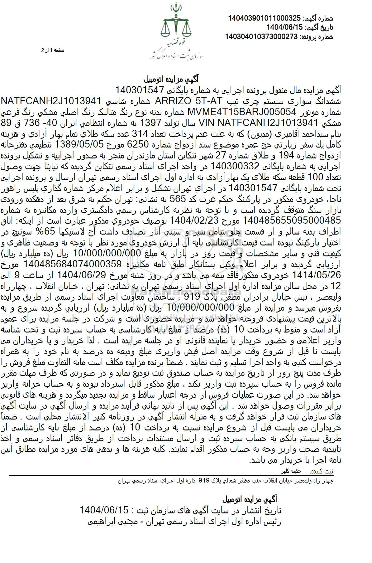 مزایده فروش یک دستگاه خودروی سواری چری مدل 1397