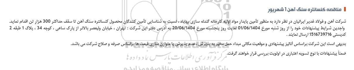 مناقصه کنسانتره سنگ آهن 1 شهریور