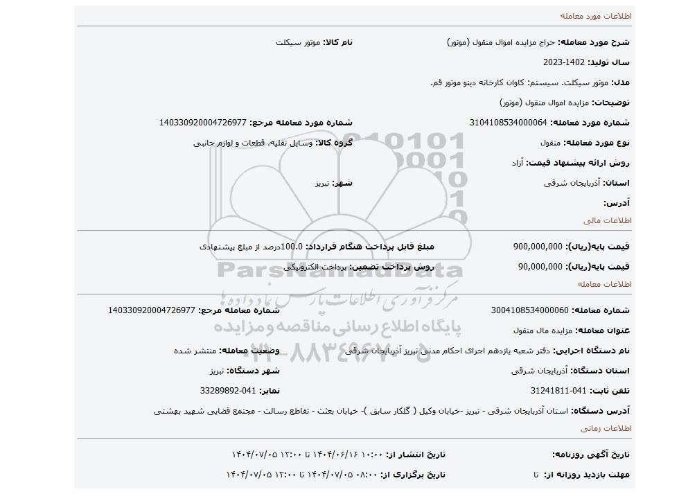 | توضیحات: مزایده اموال منقول (موتور) | ||