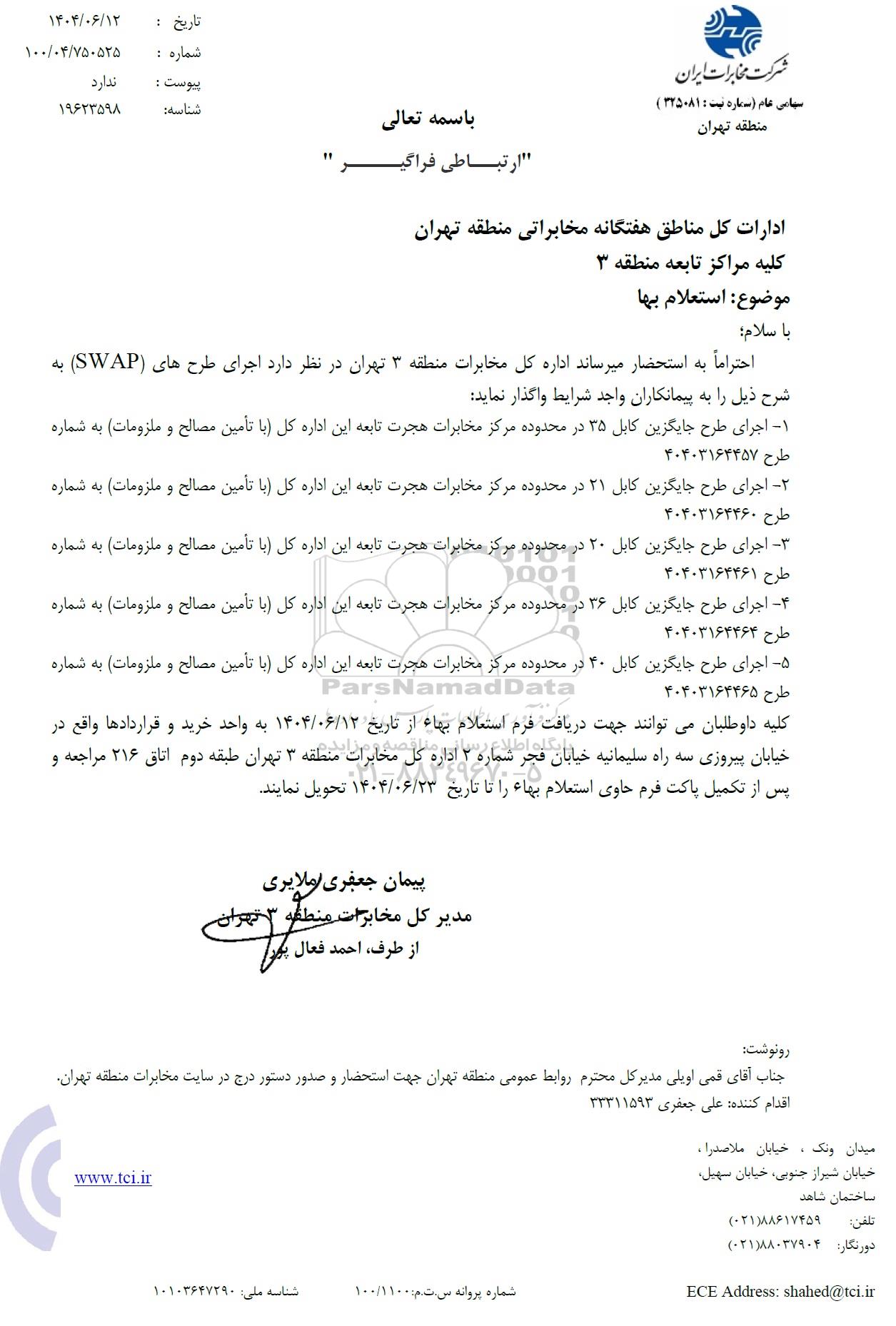 احتراماً به استحضار می رساند اداره کل مخابرات منطقه 3 تهران در نظر دارد اجرای طرح های (SWAP) به شرح ذیل را به پیمانکاران واجد شرایط واگذار نماید