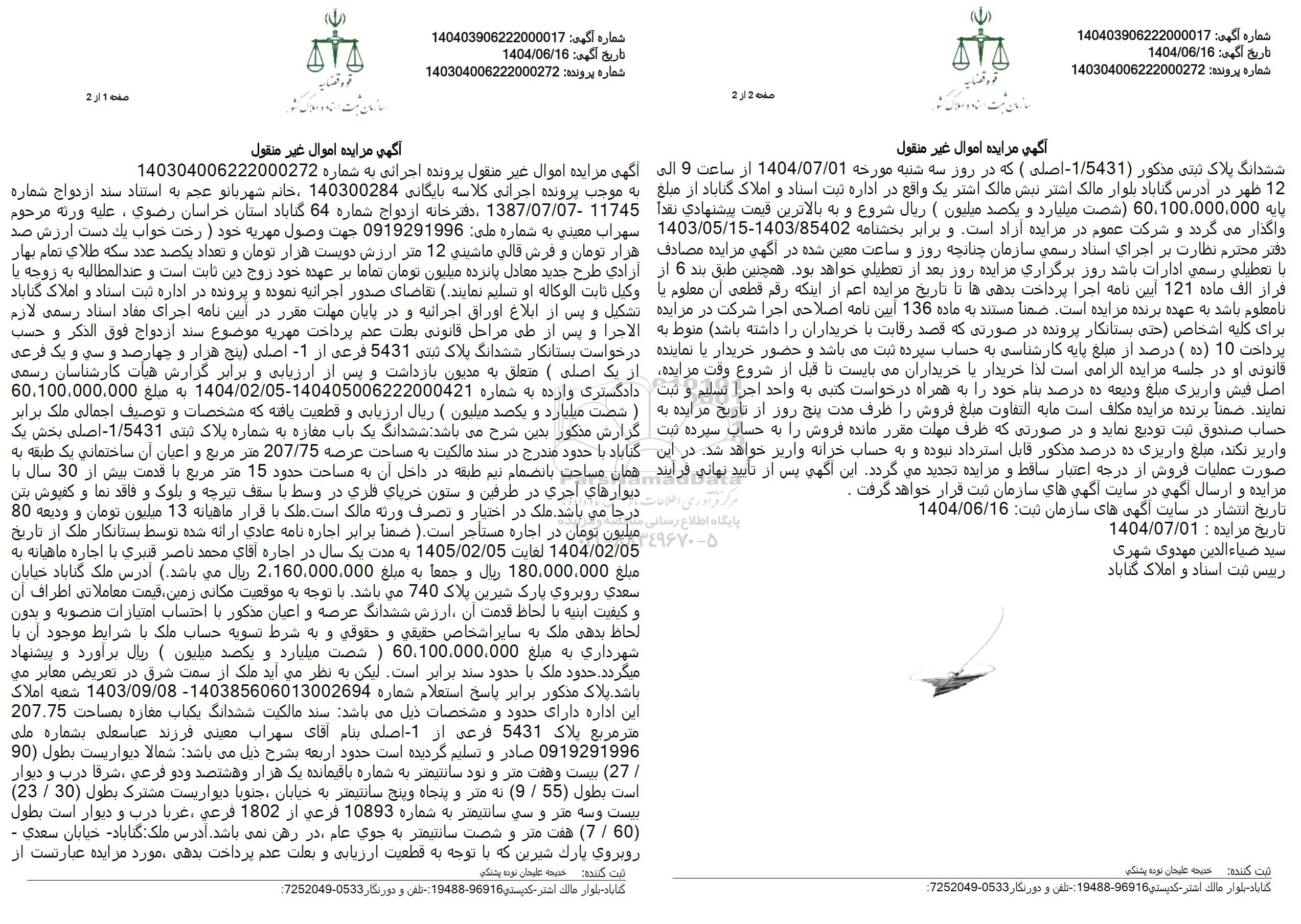 مزایده فروش ششدانگ پلاک ثبتی 5431 فرعی از 1 اصلی به مبلغ 60.100.000.000 ریال