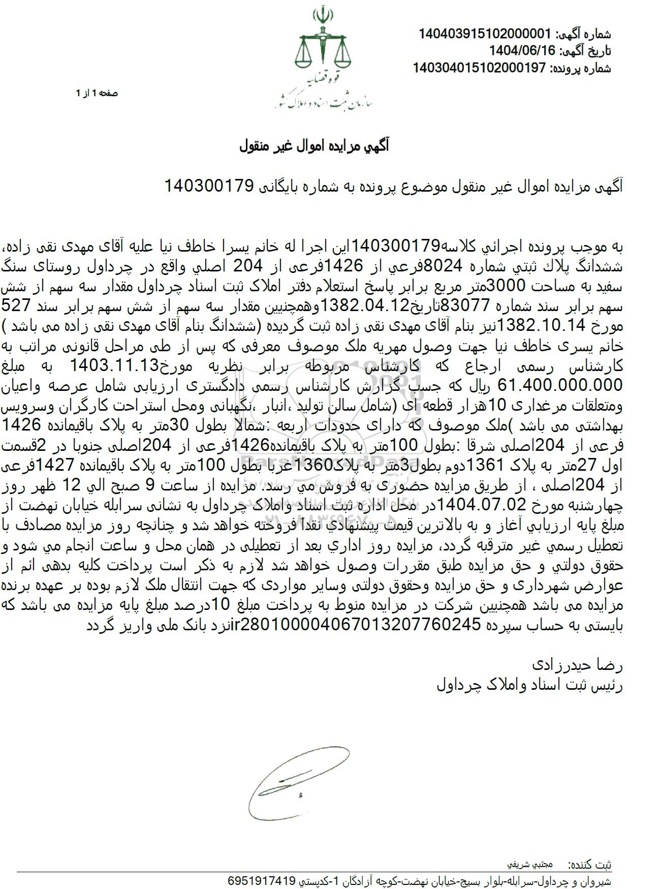مزایده فروش ششدانگ پلاک ثبتی شماره 8024 فرعی از 1426 فرعی از 204 اصلی به مبلغ 61.400.000.000 ریال