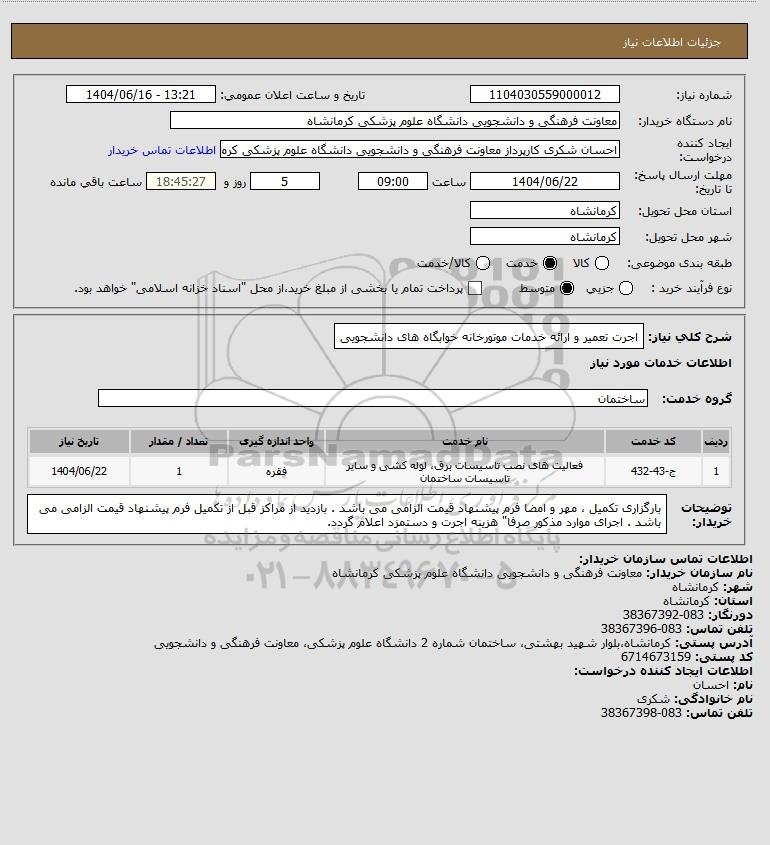 شرح کلی نیاز: اجرت تعمیر و ارائه خدمات موتورخانه خوابگاه های دانشجویی