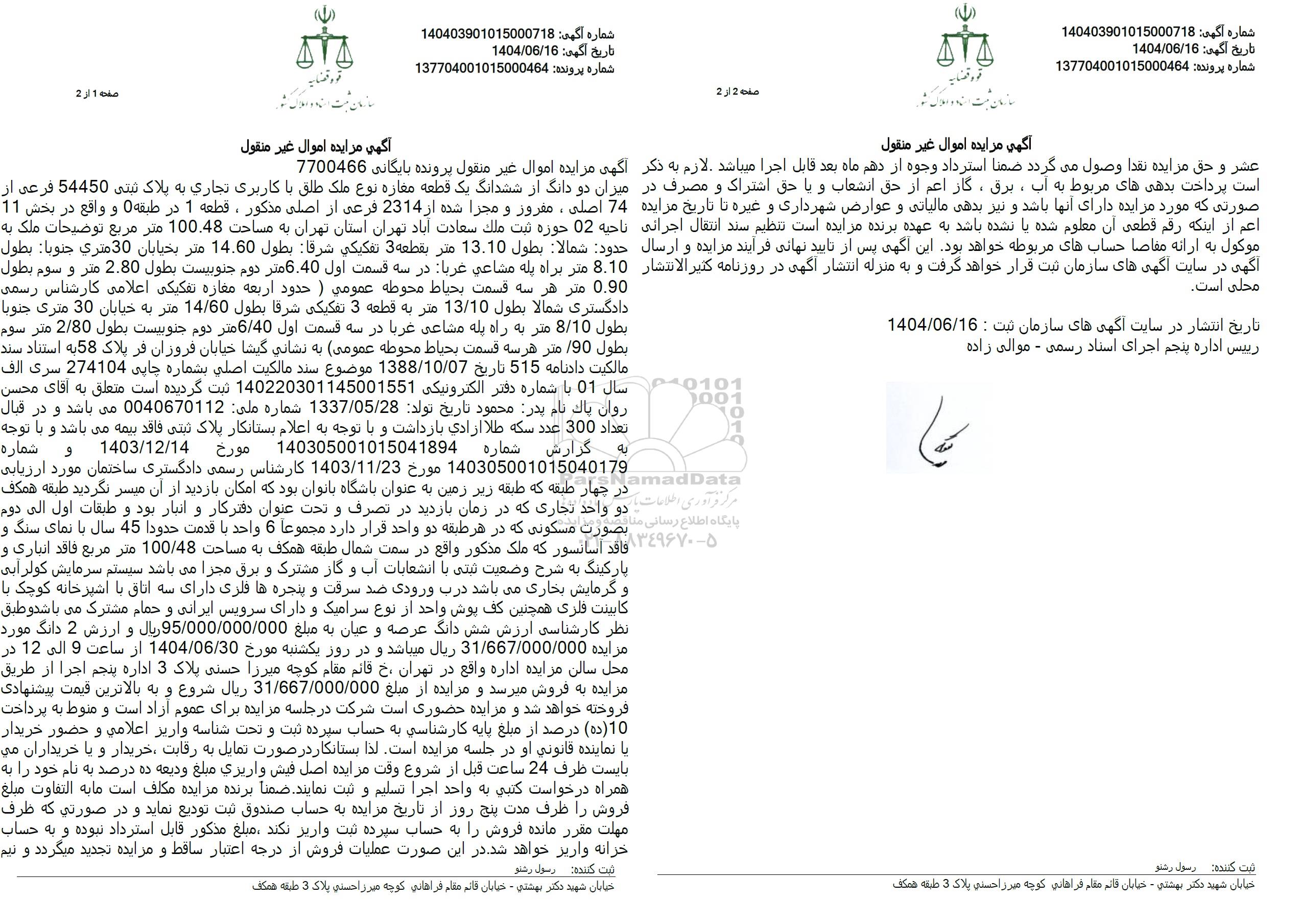 مزایده فروش یک قطعه مغازه با کاربری تجاری به مبلغ 31.667.000.000 ریال