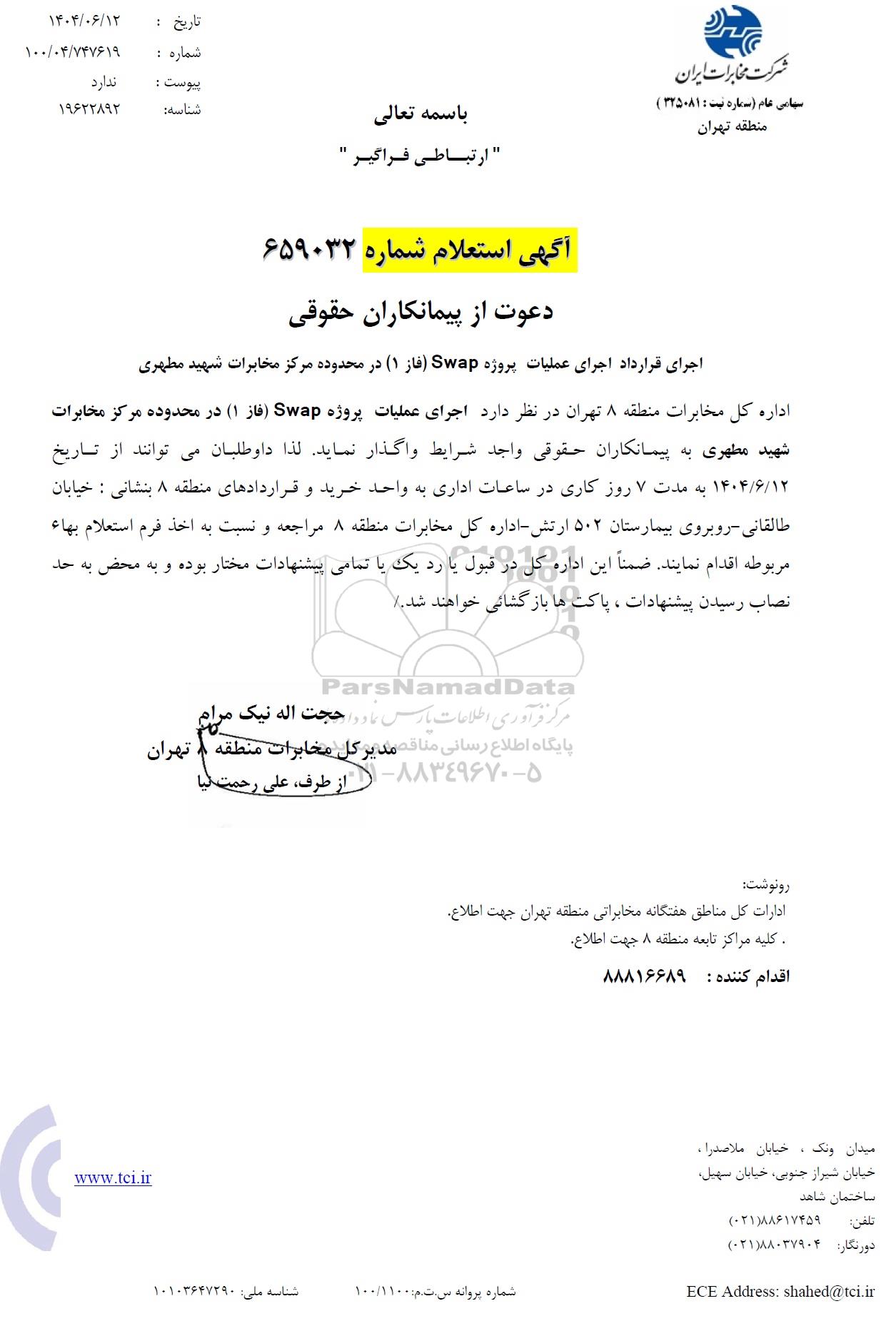 اداره کل مخابرات منطقه 8 تهران در نظر دارد اجرای عملیات پروژه Swap (فاز 1) در محدوده مرکز مخابرات شهید مطهری به پیمانکاران حقوقی واجد شرایط واگذار نماید. لذا داوطلبان می توانند از تاریخ 1404.6.12 به مدت 7 روز کاری در ساعات اداری به واحد خرید و قراردادهای منطقه 8 بنشانی : خیابان طالقانی - روبروی بیمارستان 502 ارتش اداره کل مخابرات منطقه 8 مراجعه و نسبت به اخذ فرم استعلام بهاء مربوطه اقدام نمایند. ضمناً این اداره کل در قبول یا رد یک یا تمامی پیشنهادات مختار بوده و به محض به حد نصاب رسیدن پیشنهادات ، پاکتها بازگشائی خواهند شد.