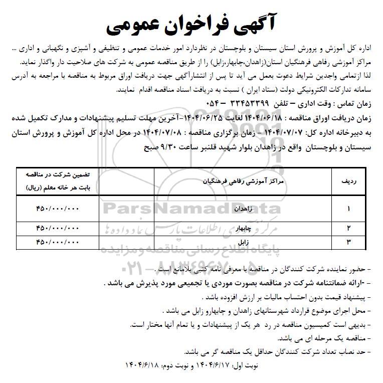 اداره کل آموزش و پرورش استان سیستان و بلوچستان در نظر دارد امور خدمات عمومی و تنظیفی و آشپزی و نگهبانی و اداری ..... مراکز آموزشی رفاهی فرهنگیان استان زاهدان چابهار زابل را از طریق مناقصه عمومی به شرکتهای صلاحیت دار واگذار نماید. لذا از تمامی واجدین شرایط دعوت بعمل می آید تا پس از انتشار آگهی جهت دریافت اوراق مربوط به مناقصه با مراجعه به آدرس سامانه تدارکات الکترونیکی دولت ستاد ایران ( نسبت به دریافت اسناد مناقصه اقدام نمایند.