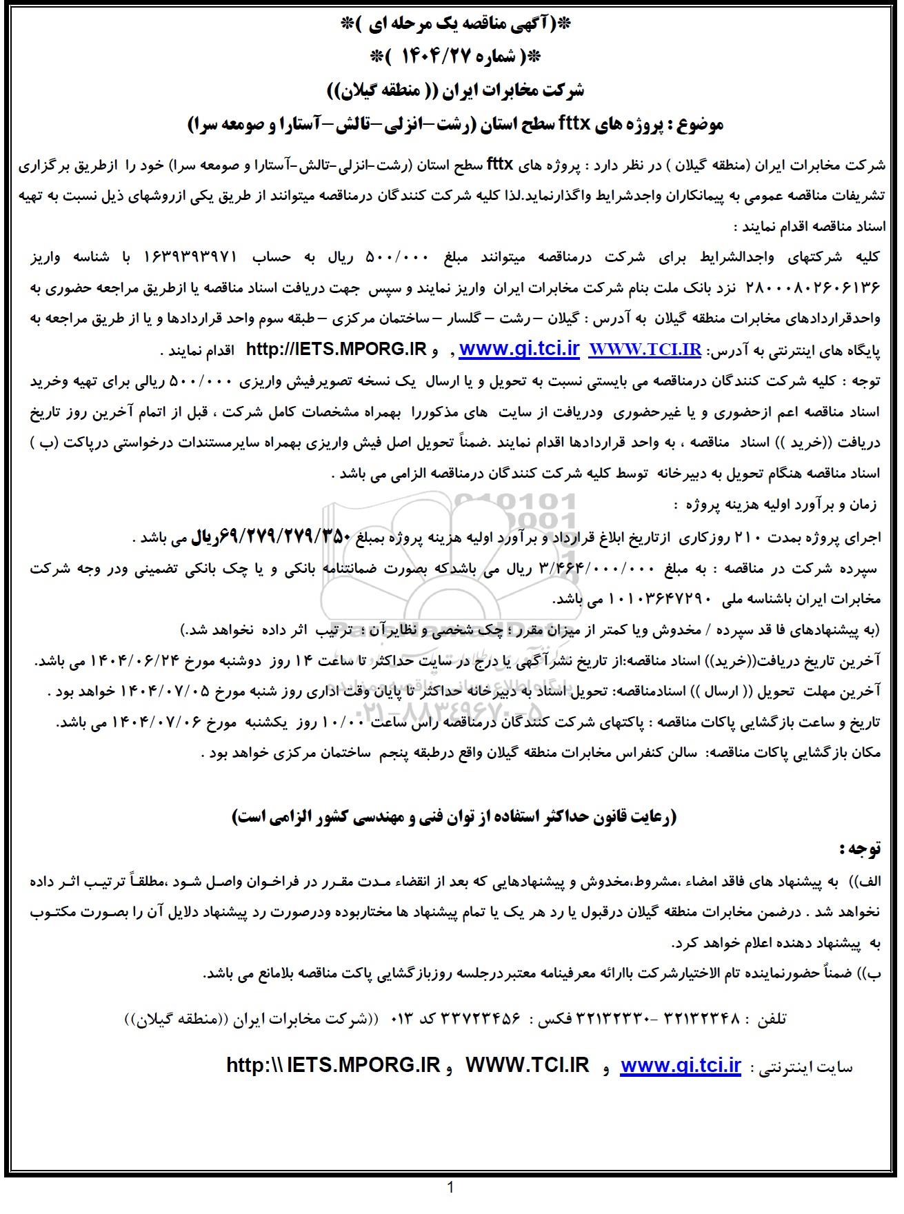 شرکت مخابرات ایران (منطقه گیلان ) در نظر دارد : پروژه های fttx سطح استان (رشت - انزلی - تالش - آستارا و صومعه سرا) خود را از طریق برگزاری تشریفات مناقصه عمومی به پیمانکاران واجد شرایط واگذار نماید. لذا کلیه شرکت کنندگان در مناقصه میتوانند از طریق یکی از روشهای ذیل نسبت به تهیه اسناد مناقصه اقدام نمایند :