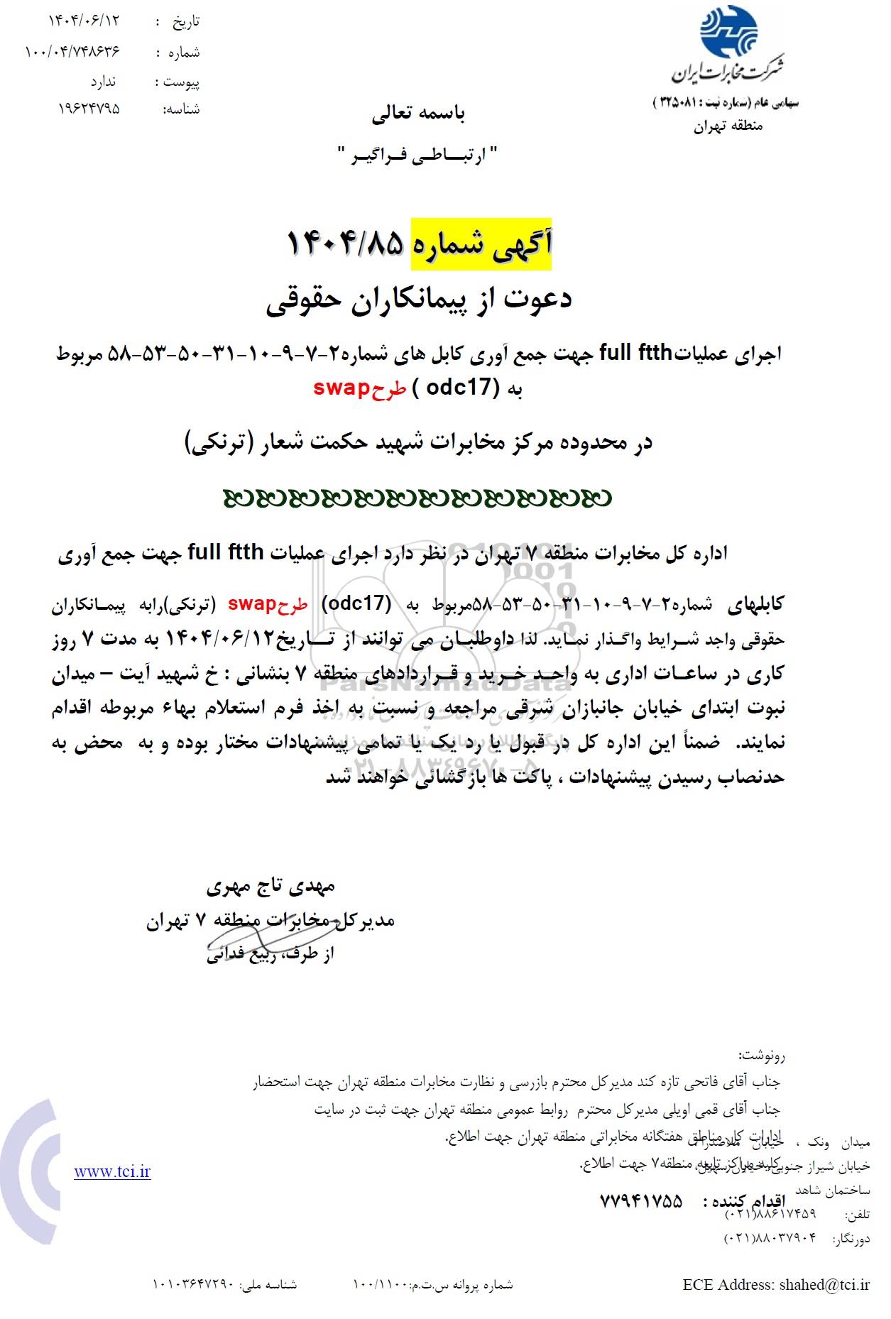 اداره کل مخابرات منطقه 7 تهران در نظر دارد اجرای عملیات full ftth جهت جمع آوری کابل های شماره 2 - 7 - 9 - 10 - 31 - 50 - 53 - 58 مربوط به (odc17) طرح swap (ترنکی) را به پیمانکاران حقوقی واجد شرایط واگذار نماید. لذا داوطلبان میتوانند از تاریخ 1404.06.12 به مدت 7 روز کاری در ساعات اداری به واحد خرید و قراردادهای منطقه 7 بنشانی : خ شهید آیت – میدان نبوت ابتدای خیابان جانبازان شرقی مراجعه و نسبت به اخذ فرم استعلام بهاء مربوطه اقدام نمایند. ضمناً این اداره کل در قبول یا رد یک یا تمامی پیشنهادات مختار بوده و به محض به حد نصاب رسیدن پیشنهادات ، پاکتها بازگشایی خواهند شد.