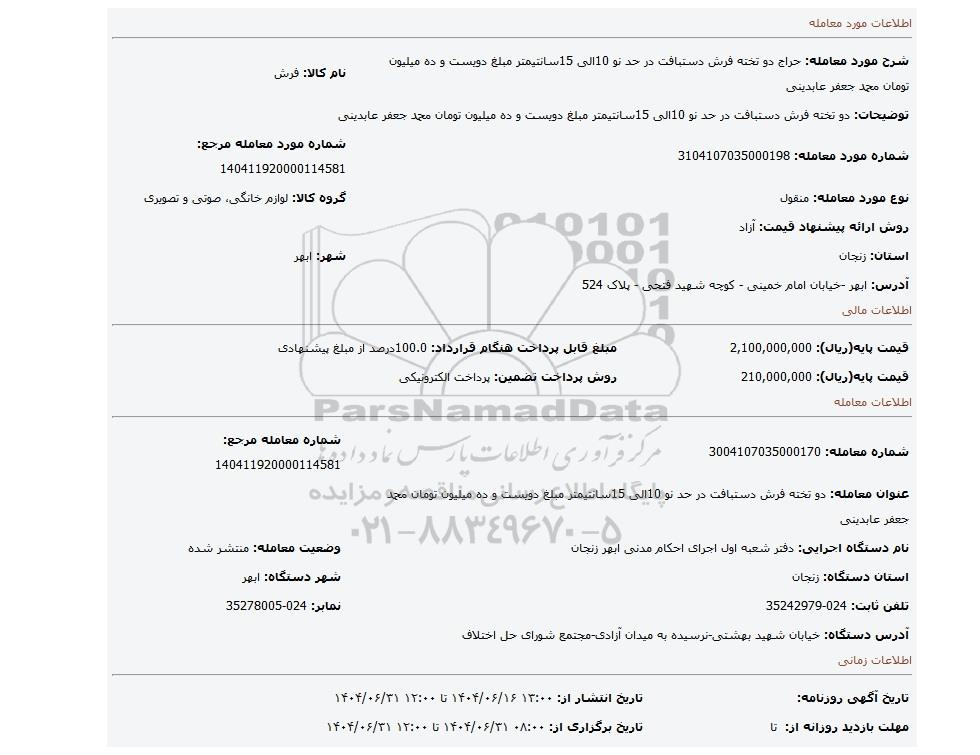 عنوان معامله: دو تخته فرش دستبافت در حد نو 10الی 15سانتیمتر مبلغ دویست و ده میلیون تومان محمد جعفر عابدینی
