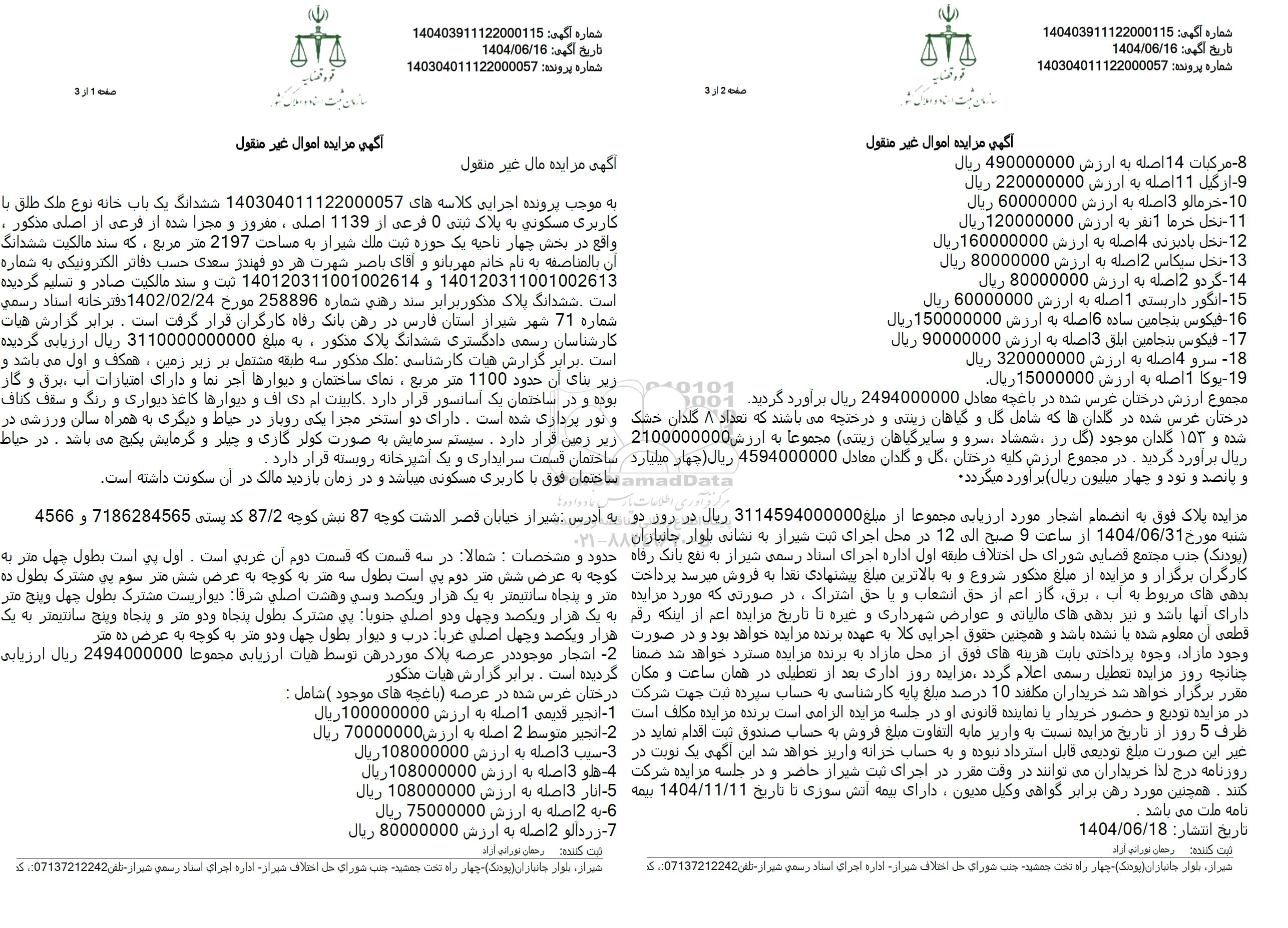 مزایده یک باب خانه به مساحت 2197 مترمربع پلاک ثبتی 0 فرعی از 1139 اصلی
