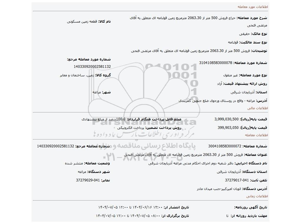 شرح مورد معامله: حراج فروش 500 متر از 2063.30 مترمربع زمین قولنامه ای متعلق به آقای مرتضی فتحی نام کالا: قطعه زمین مسکونی