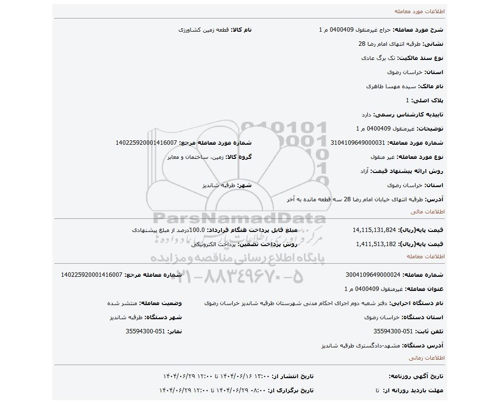 مزایده، غیرمنقول 0400409 م 1