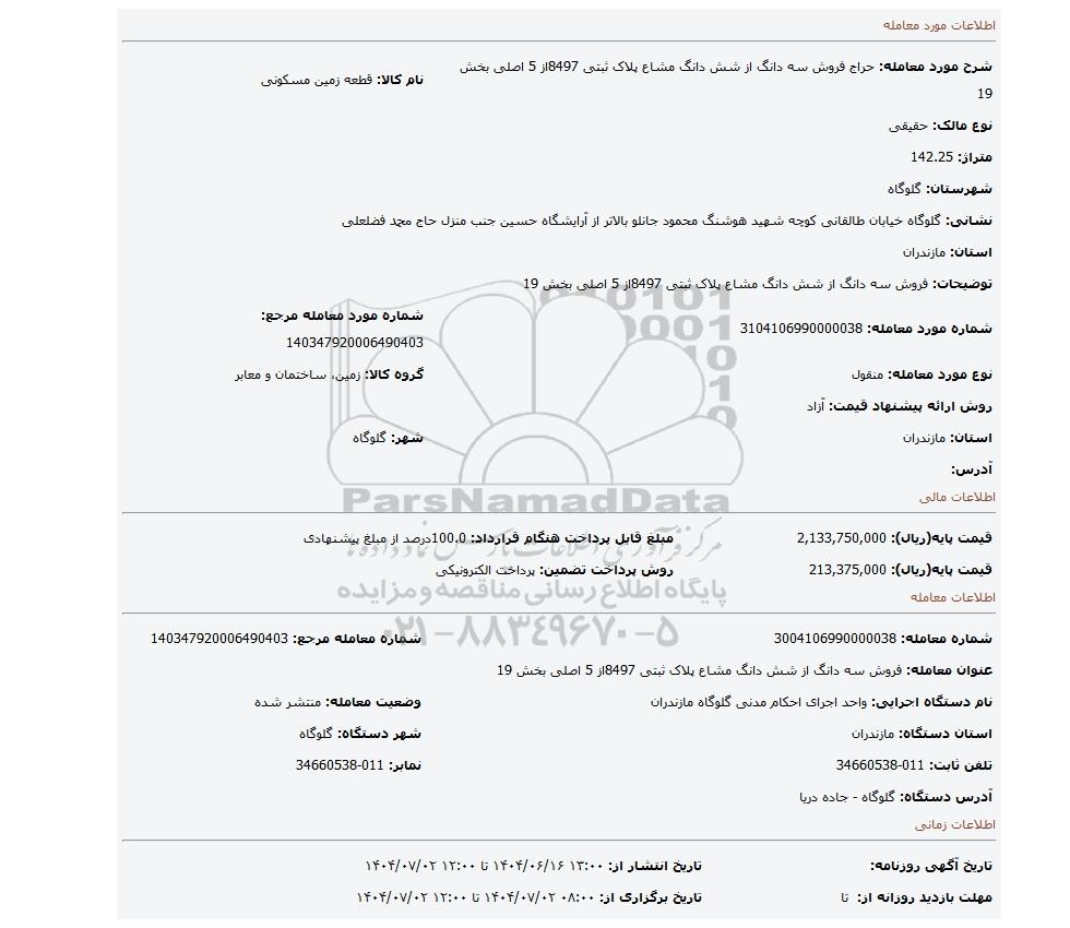 5 مزایده پلاک ثبتی 3320 فرعی از 19 اصلی   9748988 1404/08/03 new not special not payed مازندران