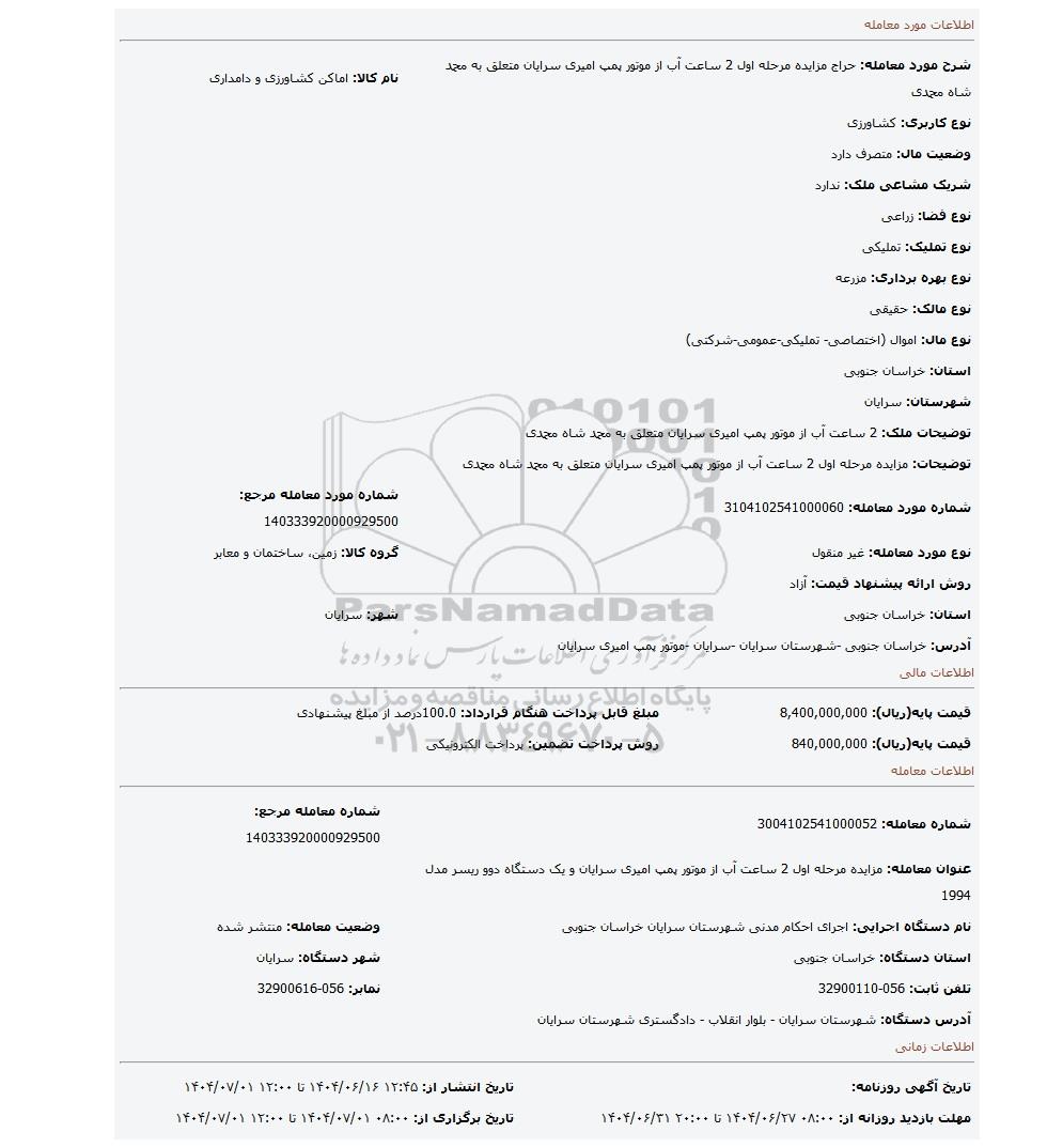 | شرح مورد معامله: حراج مزایده مرحله اول 2 ساعت آب از موتور پمپ امیری سرایان متعلق به محمد شاه محمدی | نام کالا: اماکن کشاورزی و دامداری | |