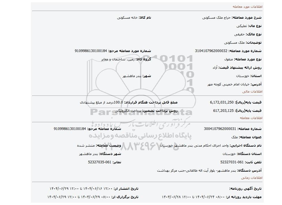 9 مزایده فروش املاک مازاد نوبت دوم 9748847 1404/08/03 new not special not payed خوزستان
