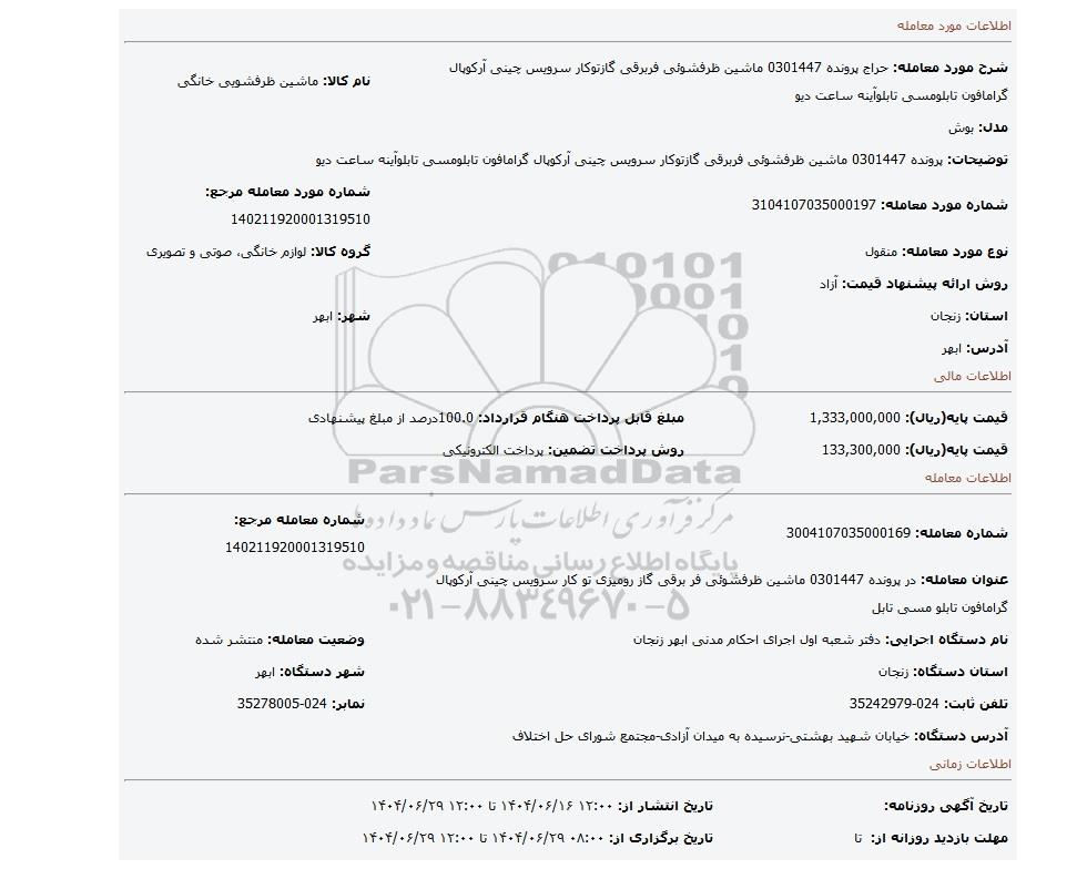 | عنوان معامله: در پرونده 0301447 ماشین ظرفشوئی فر برقی گاز رومیزی تو کار سرویس چینی آرکوپال گرامافون تابلو مسی تابل | ||