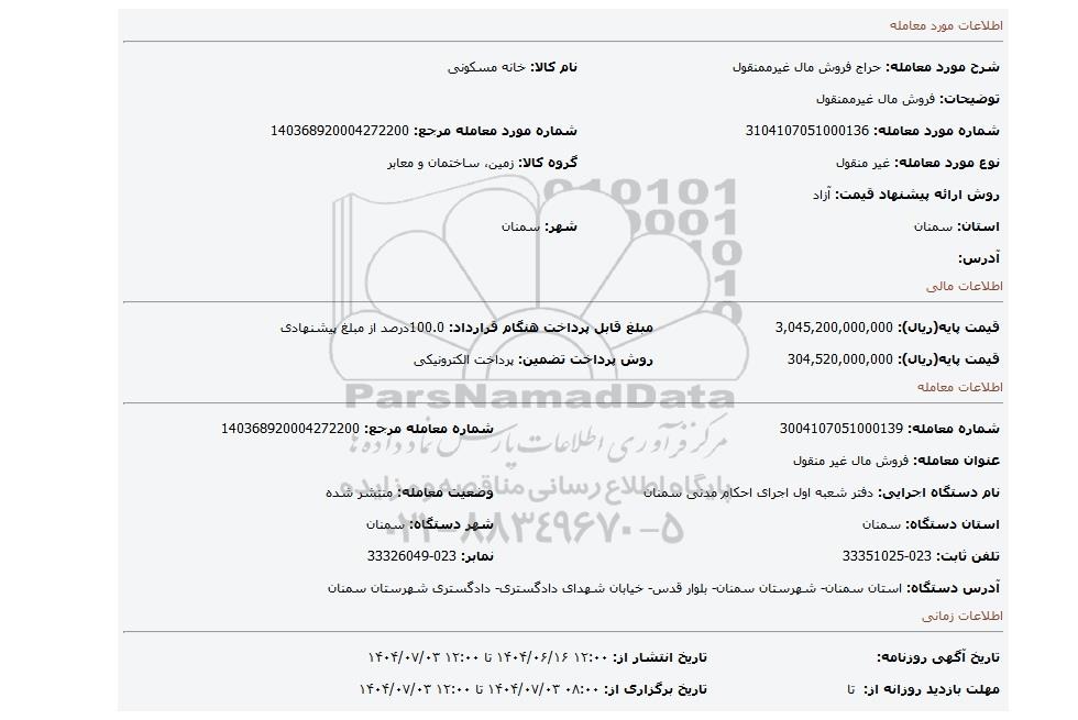 مزایده عمومی مزایده فروش مال غیرممنقول برگزار میگردد. از کلیه افراد متخصص و شرکت‌های واجد شرایط دعوت به عمل می‌آید تا در این مزایده با کد خبرگزاری پارس نماد : 9514095 شرکت نمایند تاریخ شروع مزایده : 1404/06/16 مهلت شرکت در مزایده: تا پایان روز 1404/07/03 مکان برگزاری اموال واگذاری استان‌های سمنان و دسته‌بندی‌های مربوط به این حراجی املاک و زمین میباشد. اطلاعات دقیق‌تر درباره شرایط شرکت در مزایده آنلاین و نحوه ارسال مدارک، الزامات پروژه و دریافت اسناد مزایده و تاریخ بازگشایی پاکت‌ها، در بخش اطلاعات تکمیلی این آگهی درج شده است.