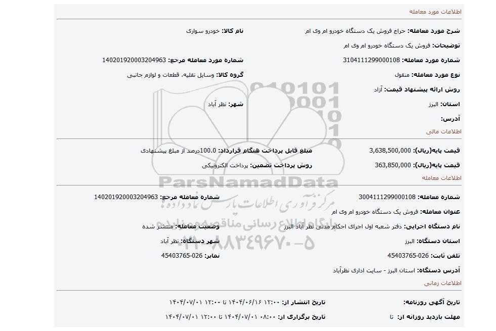 | قیمت پایه(ریال): 363,850,000 | روش پرداخت تضمین: پرداخت الکترونیکی |
