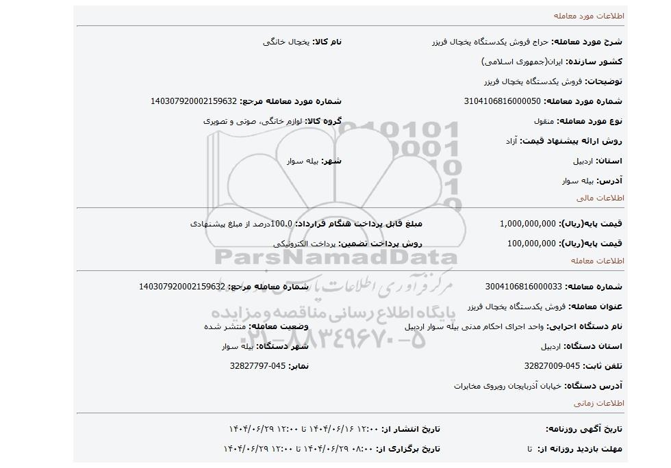 مزایده فروش یکدستگاه یخچال فریزر, مزایده، فروش یکدستگاه یخچال فریزر