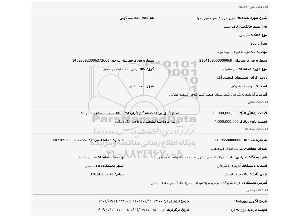 شرح مورد معامله: حراج مزایده اموال غیرمنقولنام کالا: خانه مسکونی