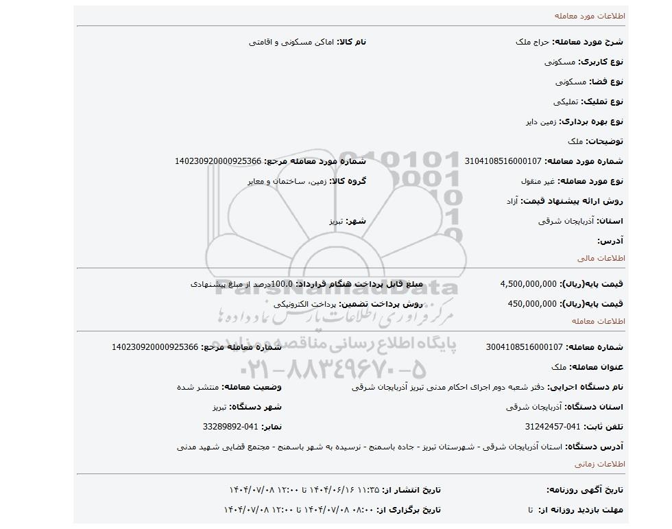 نام دستگاه اجرایی: دفتر شعبه دوم اجرای احکام مدنی تبریز آذربایجان شرقیوضعیت معامله: منتشر شده