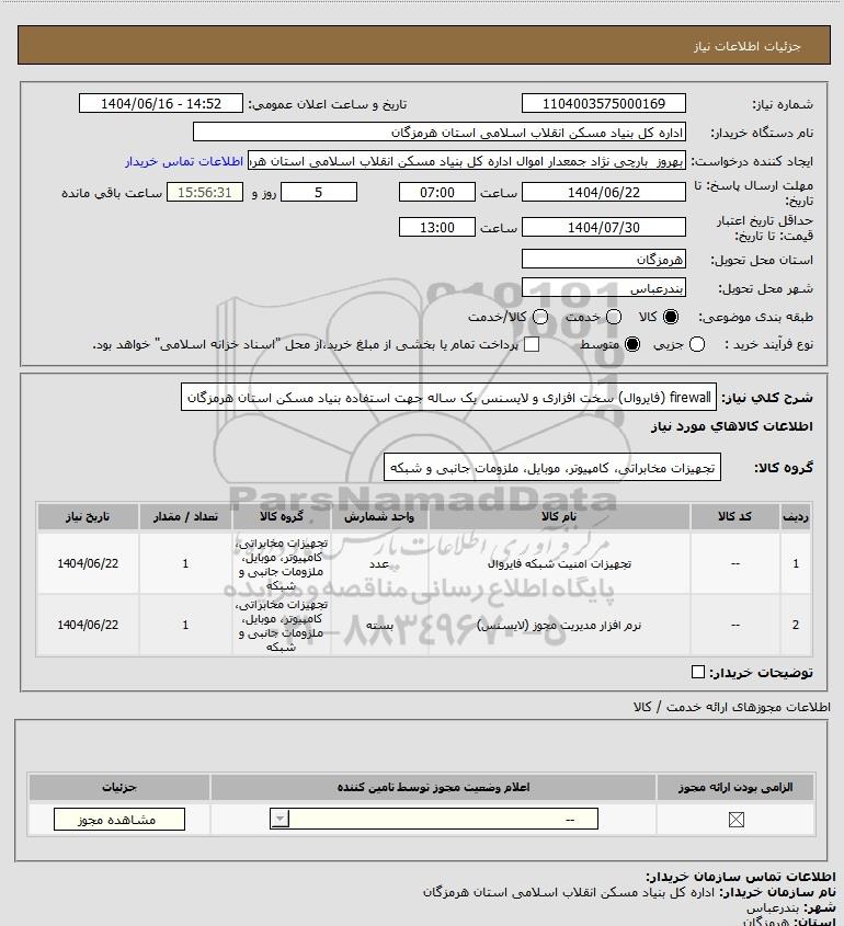 استعلام firewall (فایروال) سخت افزاری و لایسنس یک ساله جهت استفاده بنیاد مسکن استان هرمزگان, استعلام firewall (فایروال) سخت افزاری و لایسنس یک ساله جهت استفاده بنیاد مسکن استان هرمزگان