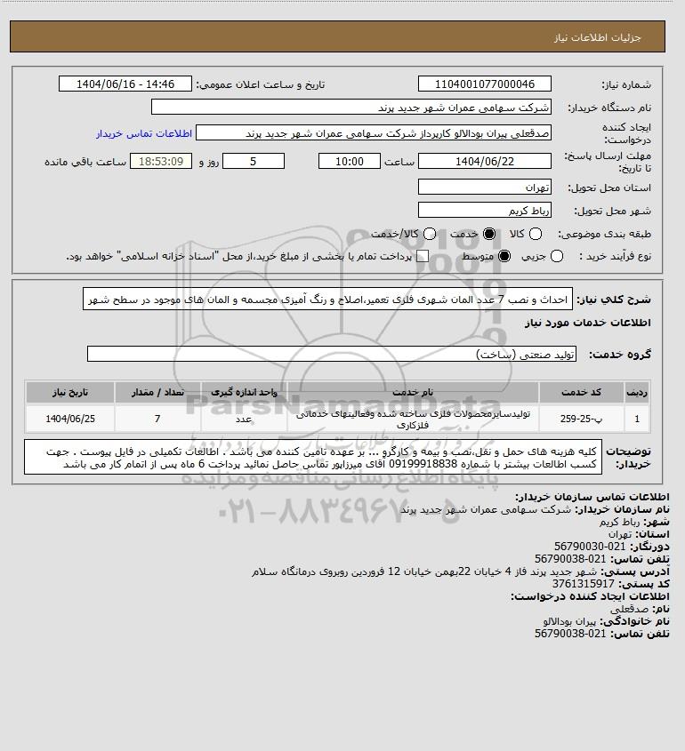 شرح کلی نیاز: احداث و نصب 7 عدد المان شهری فلزی