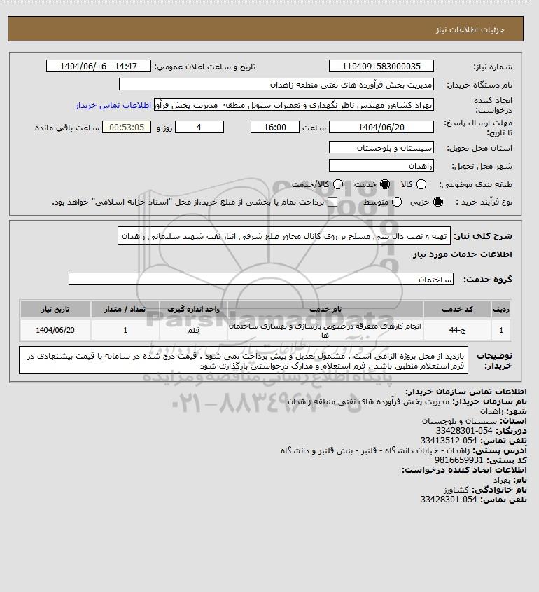 شرح کلی نیاز: تهیه و نصب دال بتنی مسلح بر روی کانال مجاور ضلع شرقی انبار نفت شهید سلیمانی زاهدان