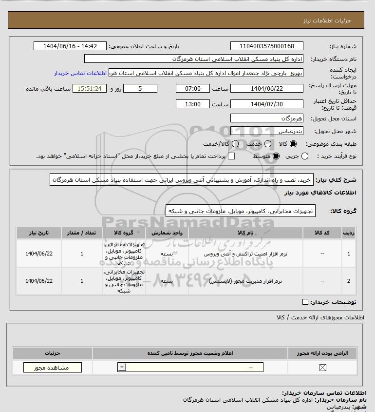 شرح کلی نیاز: خرید، نصب و راه اندازی، آموزش و پشتیبانی آنتی ویروس ایرانی جهت استفاده بنیاد مسکن استان هرمزگان
