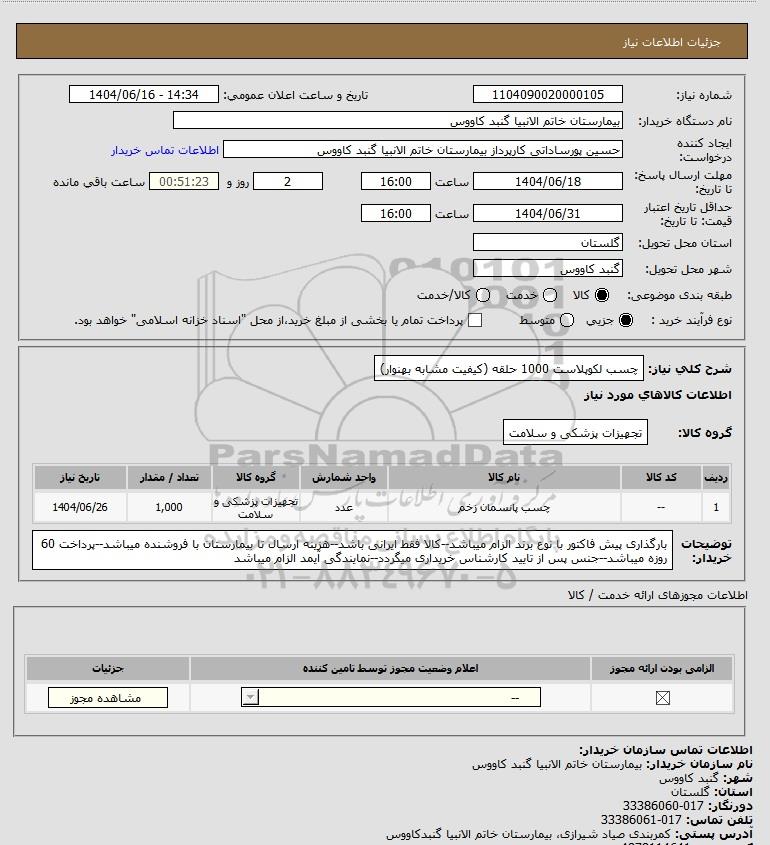 | 1 | -- | چسب پانسمان زخم | عدد | تجهیزات پزشکی و سلامت | 1,000 | 1404/06/26 |