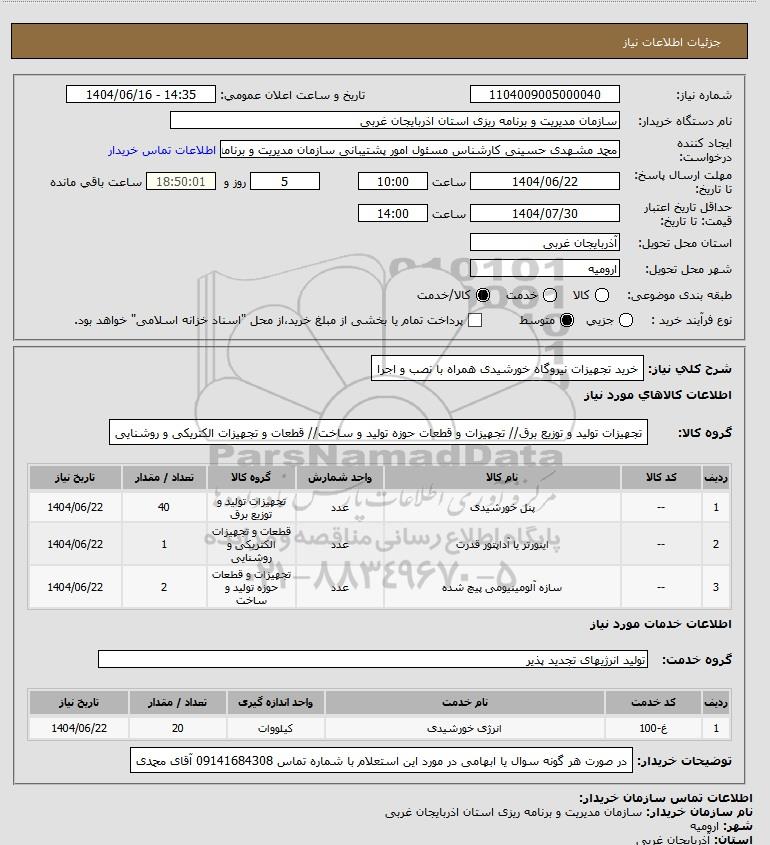 | 1 | -- | پنل خورشیدی | عدد | تجهیزات تولید و توزیع برق | 40 | 1404/06/22 |