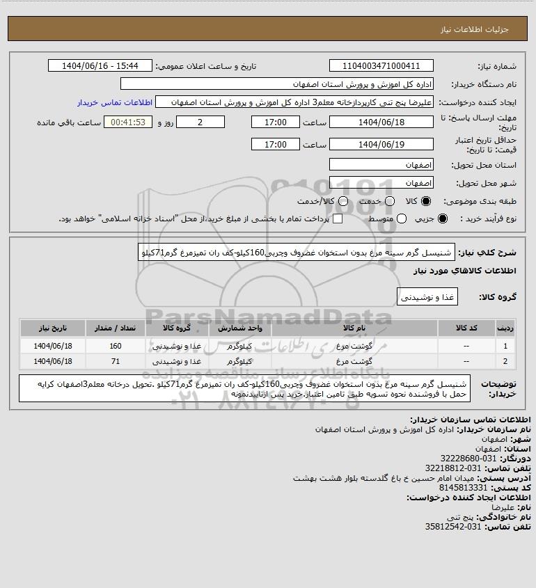 شرح کلی نیاز: شنیسل گرم سینه مرغ بدون استخوان غضروف وچربی160کیلو-کف ران تمیزمرغ گرم71کیلو