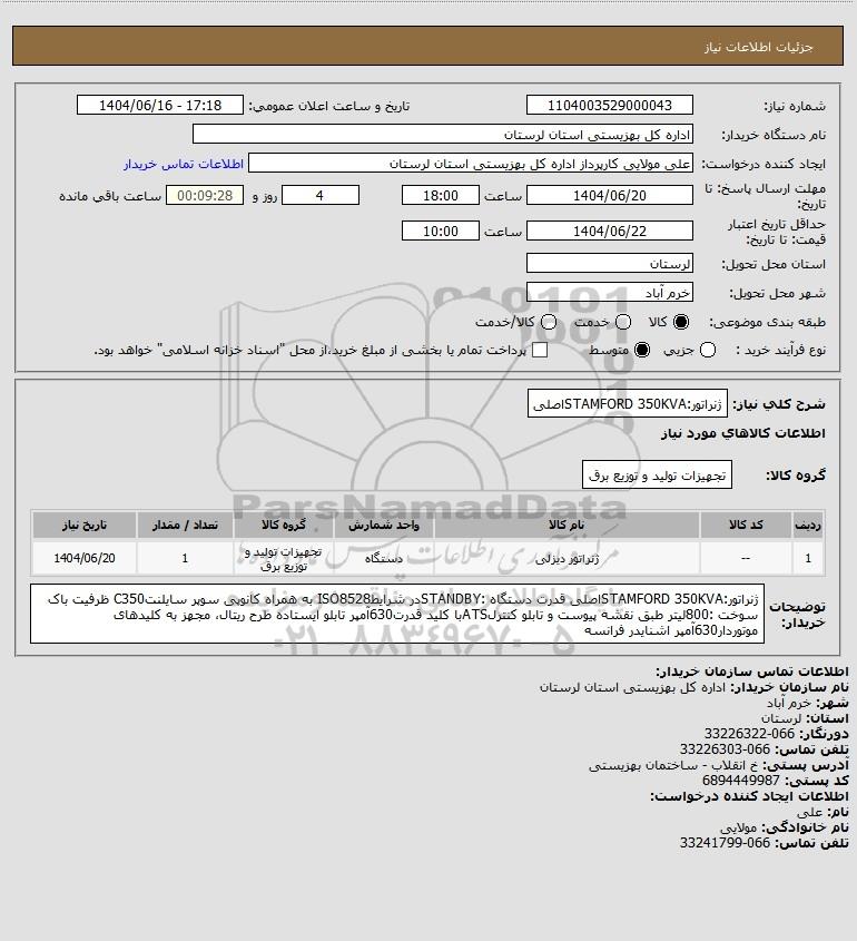 شرح کلی نیاز: ژنراتور:STAMFORD 350KVAاصلی