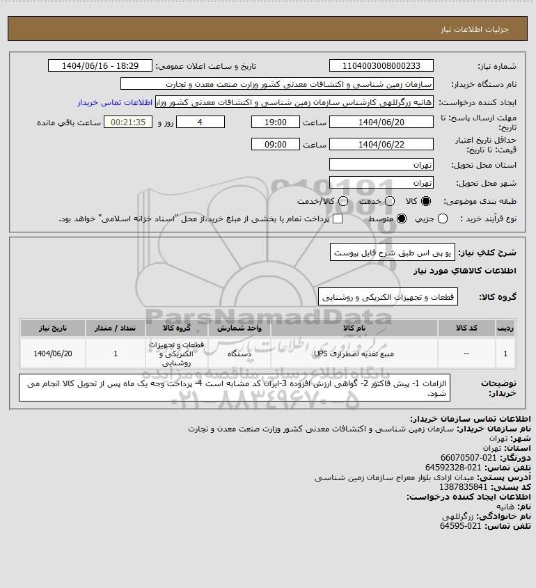 | 1 | -- | منبع تغذیه اضطراری UPS | دستگاه | قطعات و تجهیزات الکتریکی و روشنایی | 1 | 1404/06/20 |