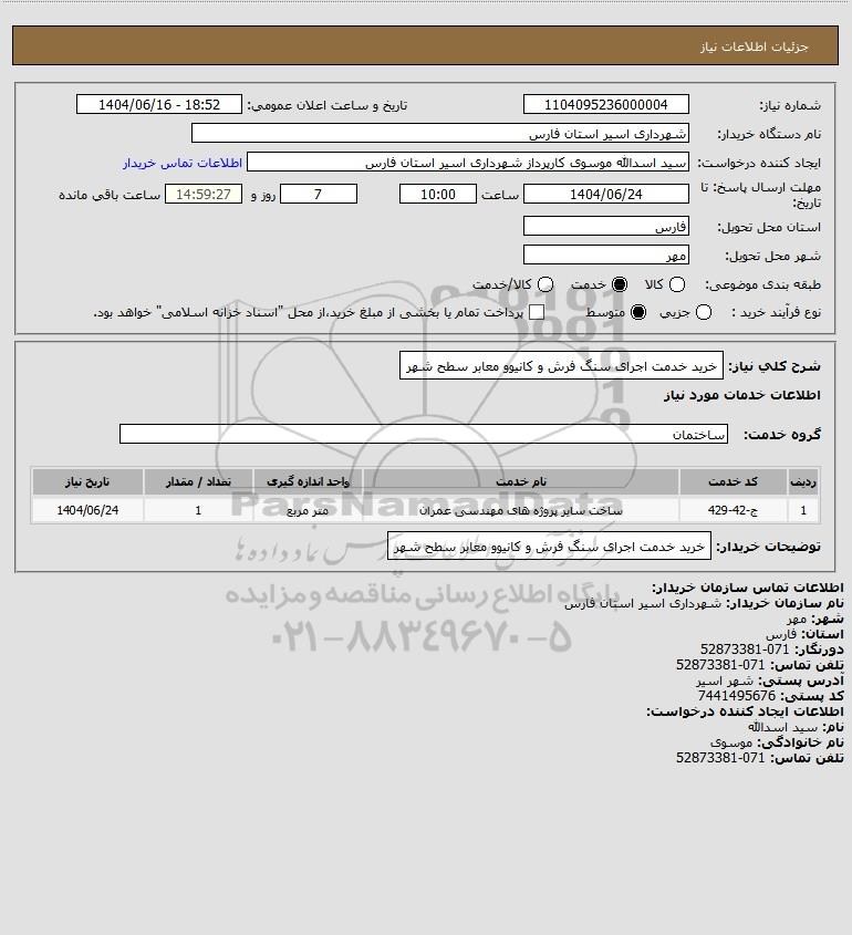 توضیحات خریدار:خرید خدمت اجرای سنگ فرش و کانیوو معابر سطح شهر