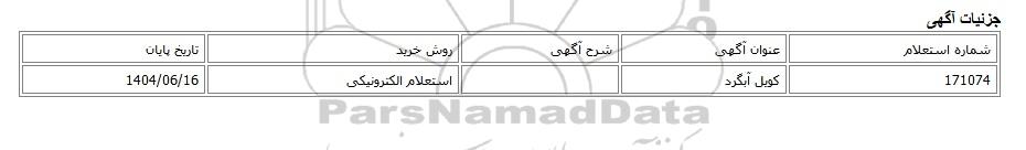 | 171074 | کویل آبگرد | استعلام الکترونیکی | 1404/06/16 |