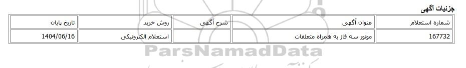 | 167732 | موتور سه فاز به همراه متعلقات | استعلام الکترونیکی | 1404/06/16 |