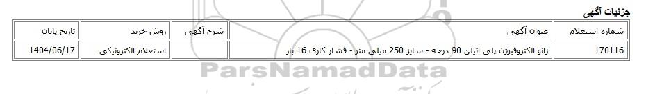 | 170116 | زانو الکتروفیوژن پلی اتیلن 90 درجه - سایز 250 میلی متر - فشار کاری 16 بار | استعلام الکترونیکی | 1404/06/17 |