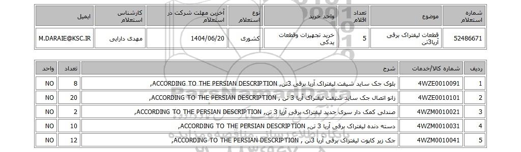 | 52486671 | قطعات لیفتراک برقی آریا3تن | 5 | خرید تجهیزات وقطعات یدکی | کشوری | 1404/06/20 | مهدی دارایی | M.DARAIE@KSC.IR |