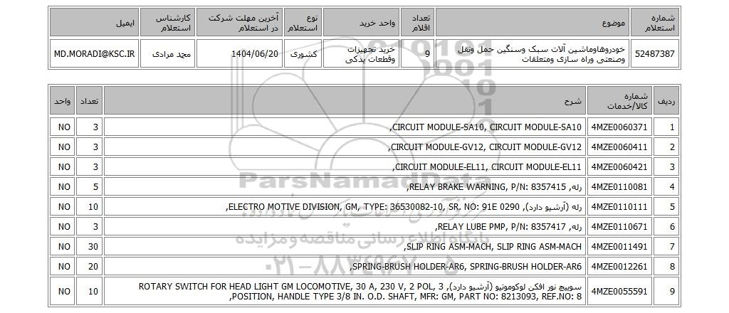 | 52487387 | خودروهاوماشین آلات سبک وسنگین حمل ونقل وصنعتی وراه سازی ومتعلقات | 9 | خرید تجهیزات وقطعات یدکی | کشوری | 1404/06/20 | محمد مرادی | MD.MORADI@KSC.IR |