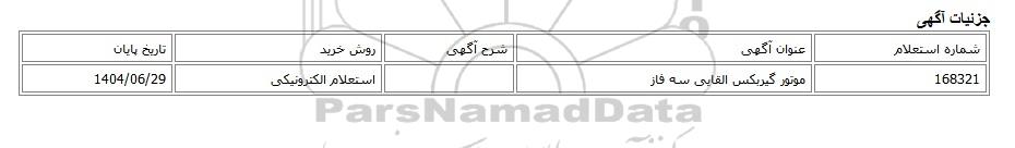 | 168321 | موتور گیربکس القایی سه فاز | استعلام الکترونیکی | 1404/06/29 |