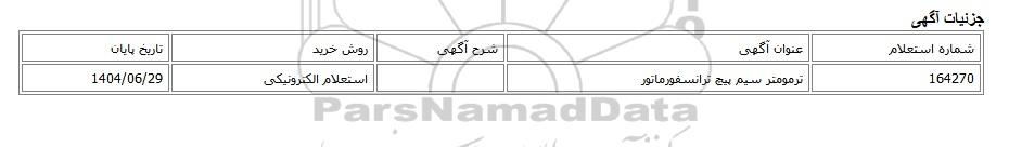 | 164270 | ترمومتر سیم پیچ ترانسفورماتور | استعلام الکترونیکی | 1404/06/29 |