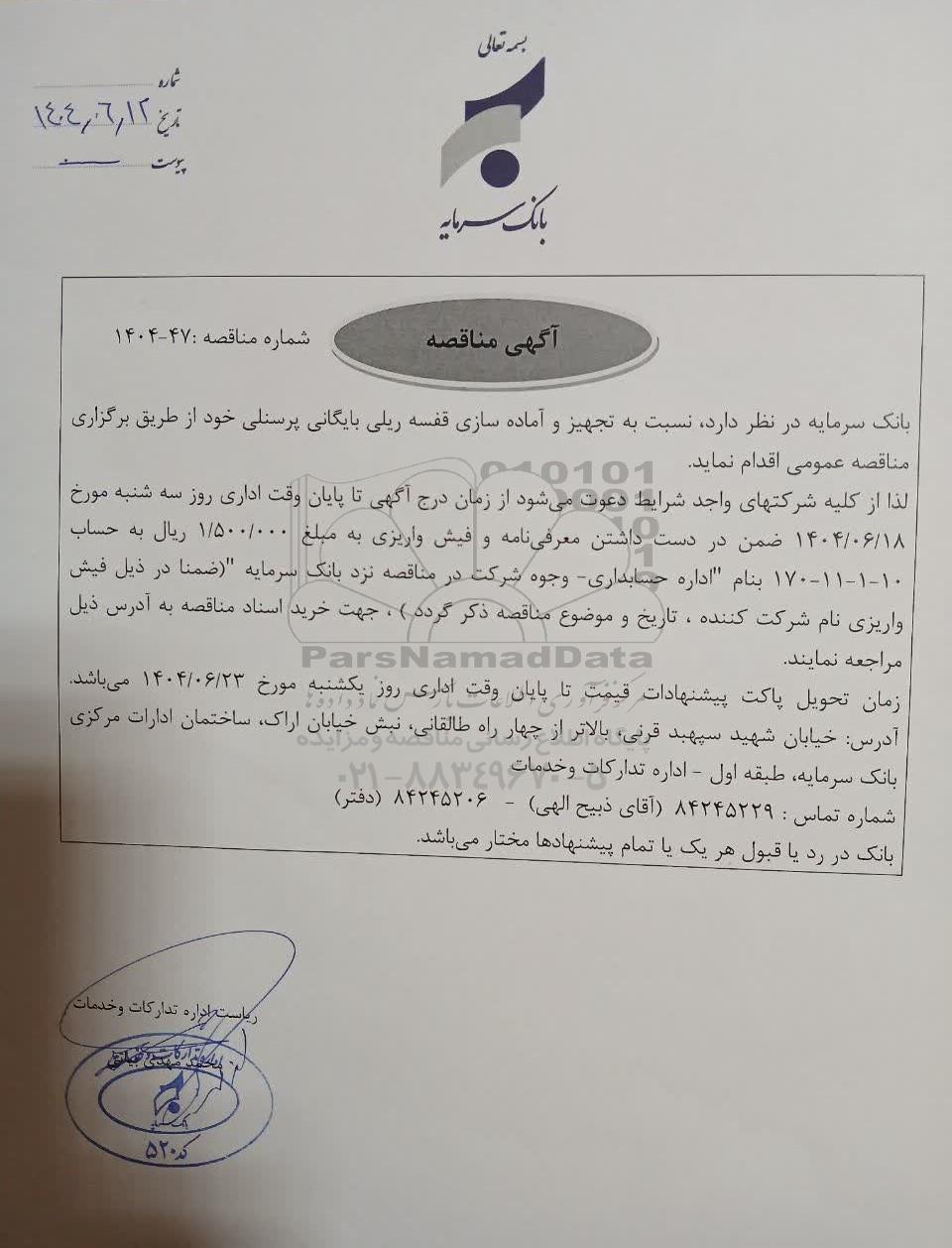 بانک سرمایه در نظر دارد، نسبت به تجهیز و آماده سازی قفسه ریلی بایگانی پرسنلی خود از طریق برگزاری مناقصه عمومی اقدام نماید.