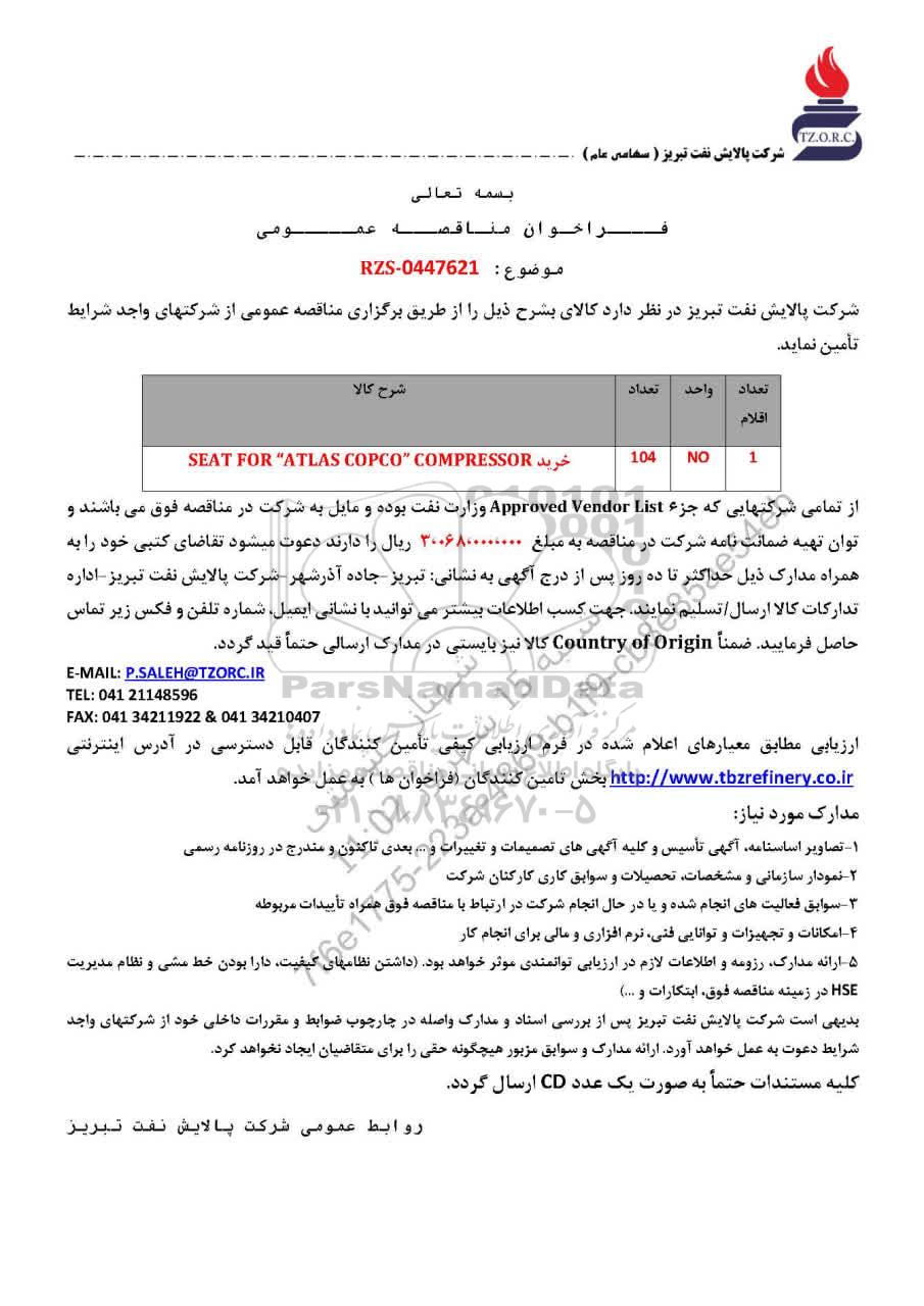مناقصه عمومی خرید SEAT FOR "ATLAS COPCO " COMPRESSOR از کلیه افراد متخصص و شرکتها واجد شرایط دعوت به عمل میآید در مناقصه با کد خبرگزاری پارس نماد: 9514971 شرکت نمایند.