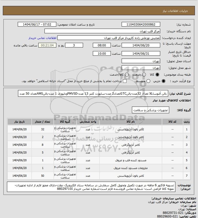 شرح کلی نیاز: بالن آلنوساXL تعداد 32عدد-بالنGTCتعداد2 عدد-ساپورت کتتر 13 عدد-PMVSDودلیوری 1 عدد-بالنAMSتعداد 50 عدد