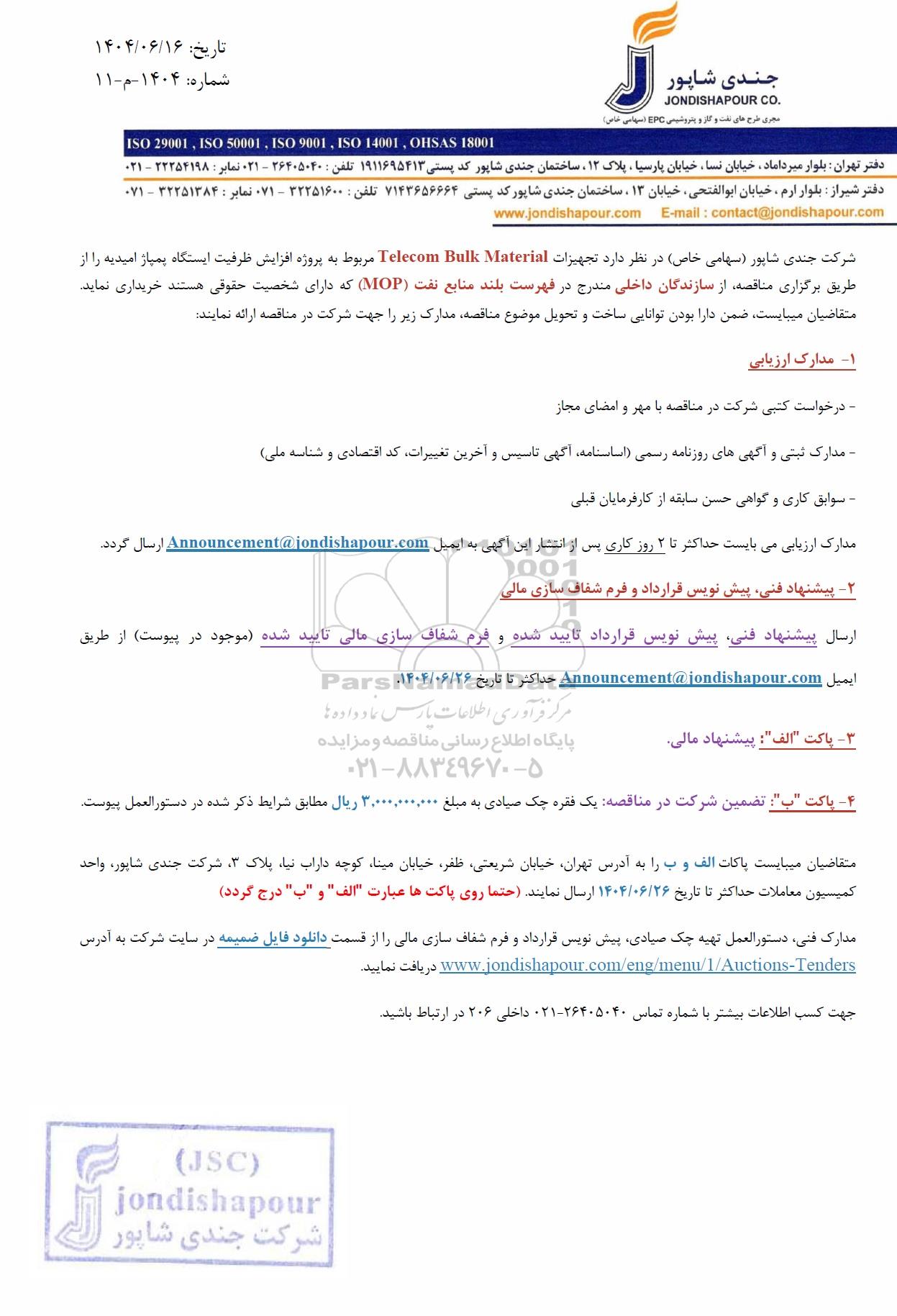 شرکت جندی شاپور (سهامی خاص) در نظر دارد تجهیزات Telecom Bulk Material مربوط به پروژه افزایش ظرفیت ایستگاه پمپاژ امیدیه را از طریق برگزاری مناقصه، از سازندگان داخلی مندرج در فهرست بلند منابع نفت (MOP) که دارای شخصیت حقوقی هستند خریداری نماید. متقاضیان میبایست، ضمن دارا بودن توانایی ساخت و تحویل موضوع مناقصه، مدارک زیر را جهت شرکت در مناقصه ارائه نمایند: