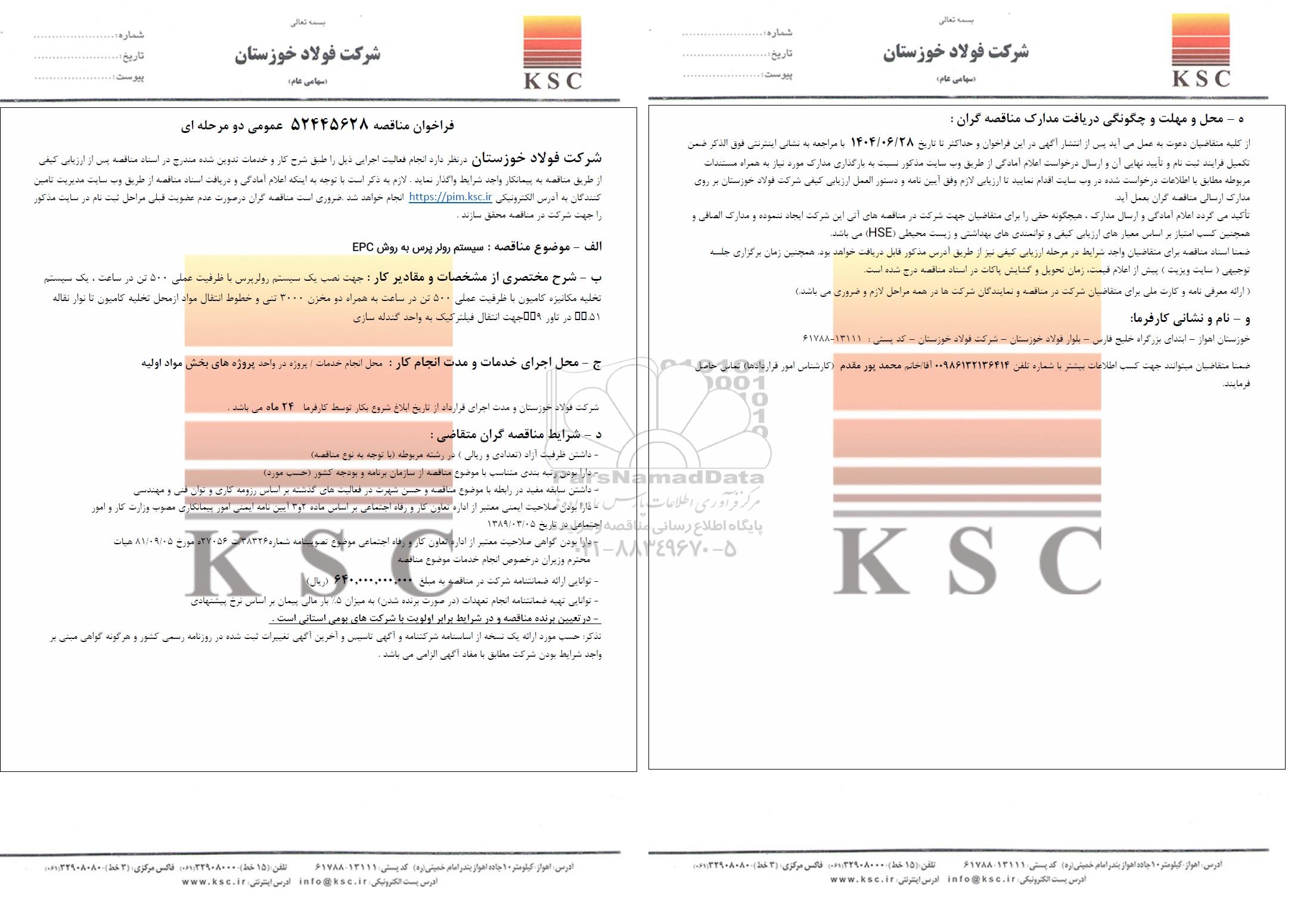 علاقه‌مندان می‌توانند جهت دریافت اسناد و اطلاعات تکمیلی، مناقصه سیستم رولر پرس به روش EPC با سامانه مناقصات و مزایدات ایران پارس‌نماد داده ها 88349670 تماس حاصل نمایند.